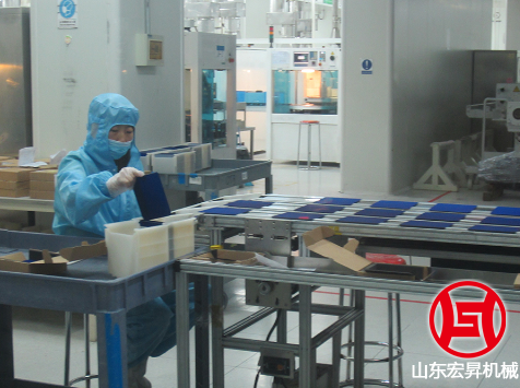背面串接好且經過檢驗合格后,將組件串、玻璃和切割好的EVA 、玻璃纖維、背板按照一定的層次敷設好,準備層壓。玻璃事先涂一層試劑(primer)以增加玻璃和EVA的粘接強度。敷設時保證電池串與玻璃等材料的相對位置,調整好電池間的距離,為層壓打好基礎。(敷設層次:由下向上:鋼化玻璃、EVA、電池片、EVA、玻璃纖維、背板)。