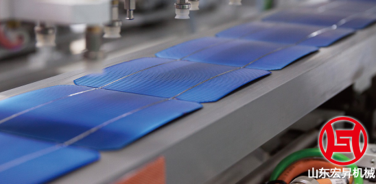 將匯流帶焊接到電池正面(負極)的主柵線上,匯流帶為鍍錫的銅帶,我們使用的焊接機可以將焊帶以多點的形式點焊在主柵線上。焊接用的熱源為一個紅外燈(利用紅外線的熱效應)。焊帶的長度約為電池邊長的2倍。多出的焊帶在背面焊接時與后面的電池片的背面電極相連。